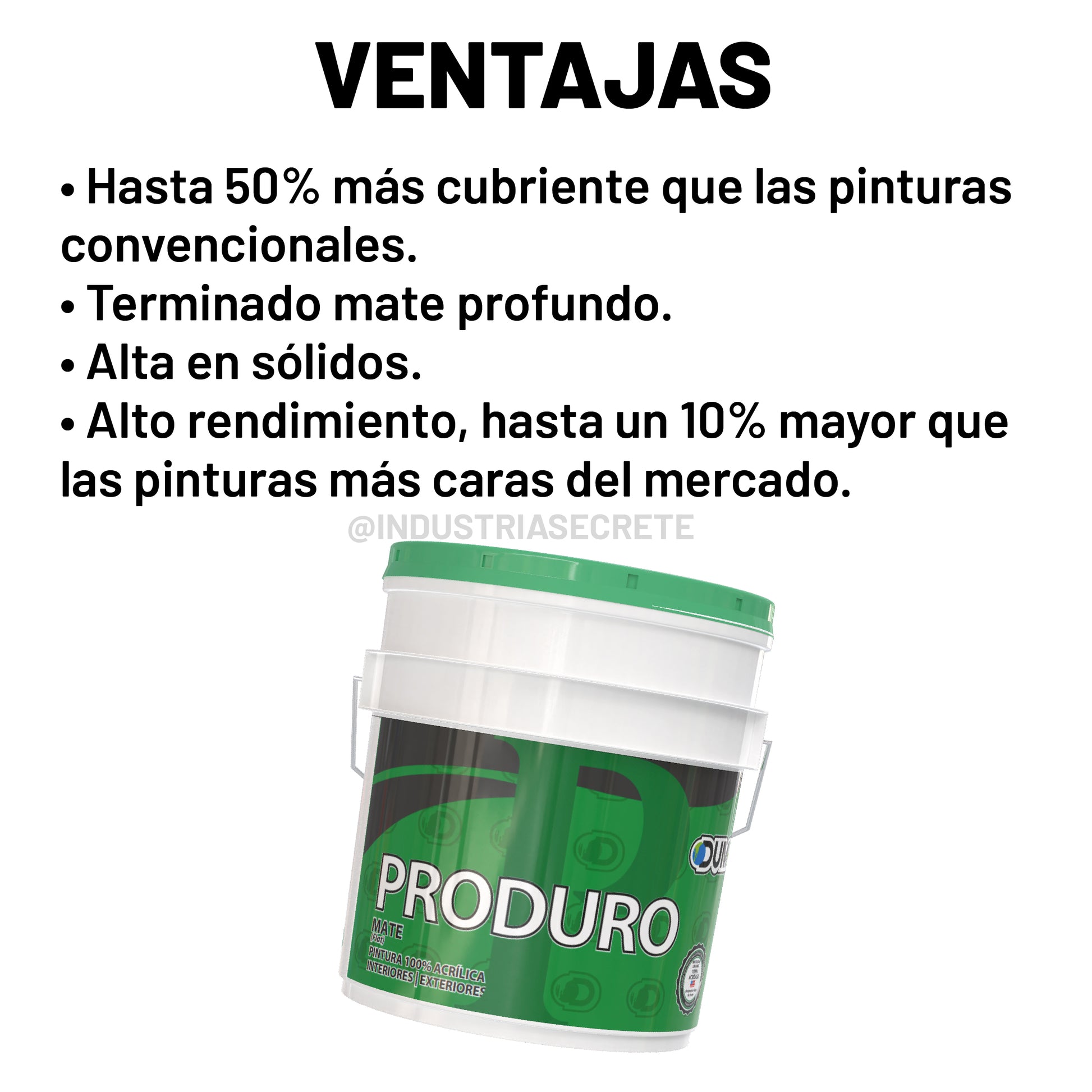Pintura 100% acrílica MATE de alta tecnología, diseñada para tener el máximo rendimiento y el mejor poder cubriente. Permite tener un acabado perfecto, ya que oculta por sus propiedades de apariencia las imperfecciones del sustrato.
